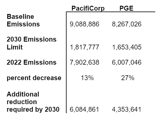 HB 2021 took effect on 1/1/2022 and we have emissions reporting data from that year. The baseline was established as the average emissions from 2010, 2011, and 2012. PGE’s emissions have fallen by 27% from the baseline and Pacific Power has fallen by 13%. This means that in the 8 years between 2022 and 2030, Pacific Power needs to reduce its carbon emissions by two-thirds. PGE must reduce its carbon emissions by half.