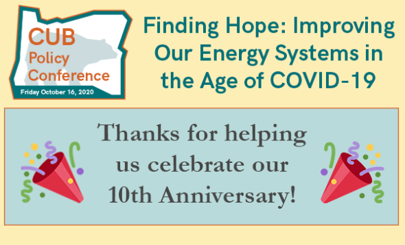 On Friday October 16, 2020, CUB convened participants from across (and even beyond) the NW energy industry for our tenth annual policy conference, Finding Hope: Improving Our Energy Systems in the Age of COVID-19. This was truly a star-studded event, featuring some of the region’s foremost experts and leaders. They spoke astutely about the opportunities and challenges facing our communities as we enter month 8 of the pandemic that has sent economies into a tailspin and killed over 600 Oregonians and over 220,000 people nationally.