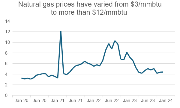 The price of gas has varied from about $3/mmbtu to $12/mmbtu. The run-up in prices in 2021 was during the winter when households needed heat. And in the summer of 2022, when households need cooling.