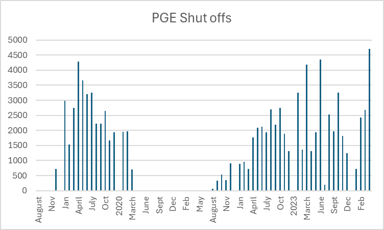 More than 4,700 households were shut off in April of this year because of non-payment. By comparison, April 2023 saw 1,313 households disconnected from their electricity. Bills going out on Feb 1 would contain January’s usage, including soaring bills from the 2024 ice storm. Customers have 60 days to pay bills, so shut-offs in April are a direct consequence of January bills and the ice storm.